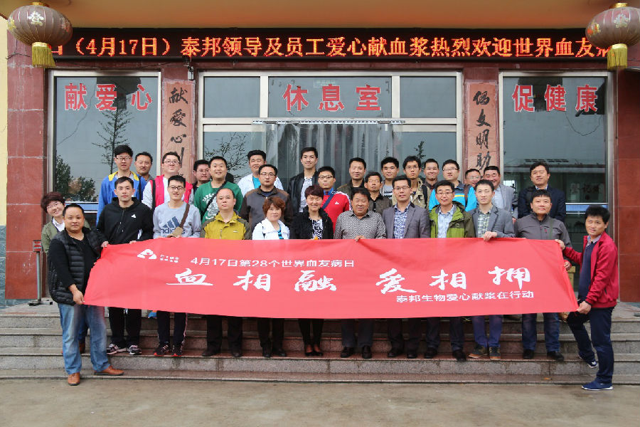 2016年4月16-17日,為迎接“第28個(gè)世界血友病日”的到來,山東泰邦生物制品有限公司組織員工五十余人到寧陽漿站舉行了捐獻(xiàn)血漿公益活動(dòng)?;顒?dòng)以“血相融· 愛相擁”為主題,旨在以泰邦人的實(shí)際行動(dòng)號(hào)召更多的愛心人士加入到獻(xiàn)漿隊(duì)伍,提高公眾對(duì)于血友病(凝血功能障礙遺傳性疾?。┑年P(guān)注度,喚起全社會(huì)對(duì)于血友病患者的關(guān)愛和支持。
